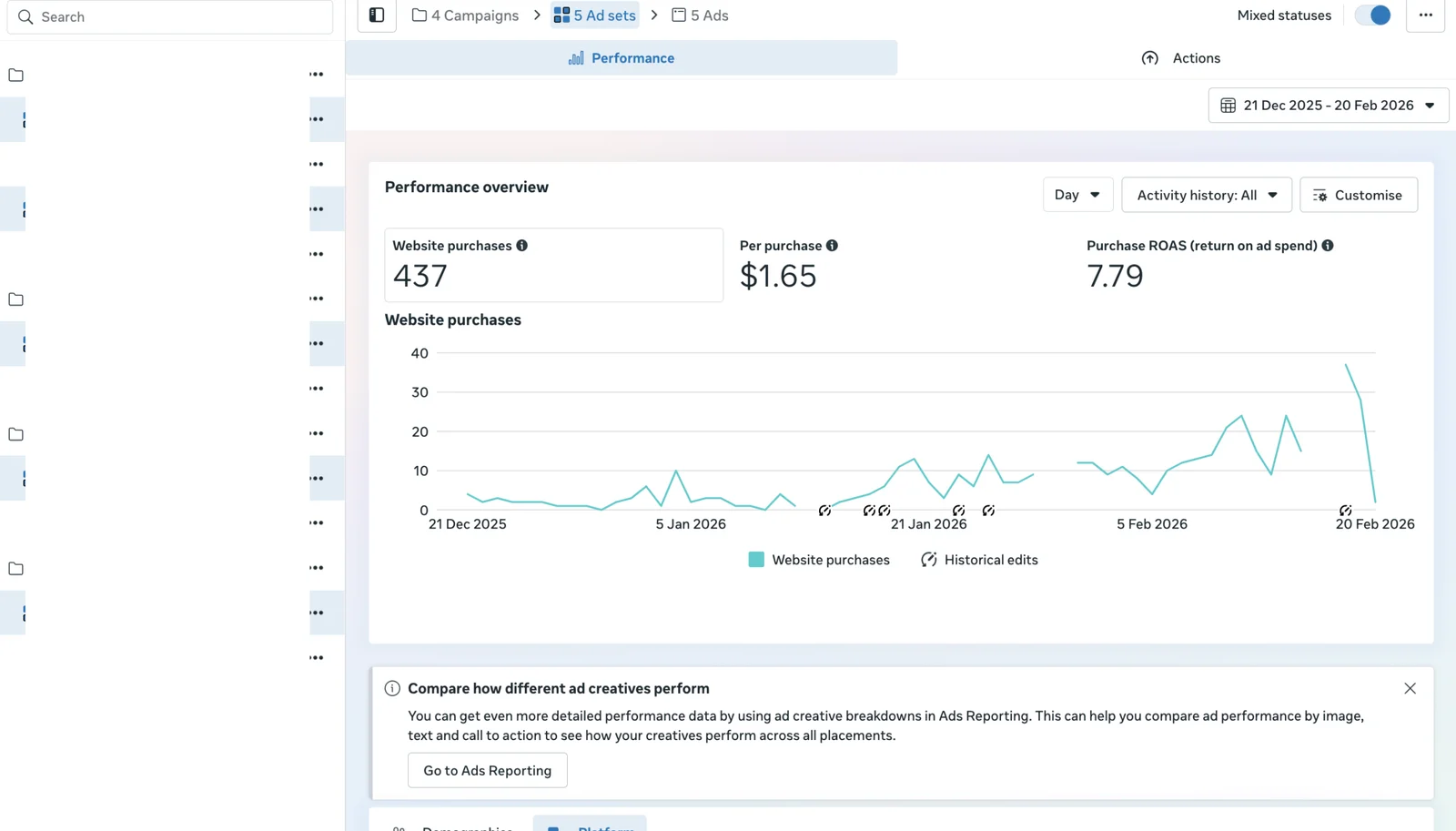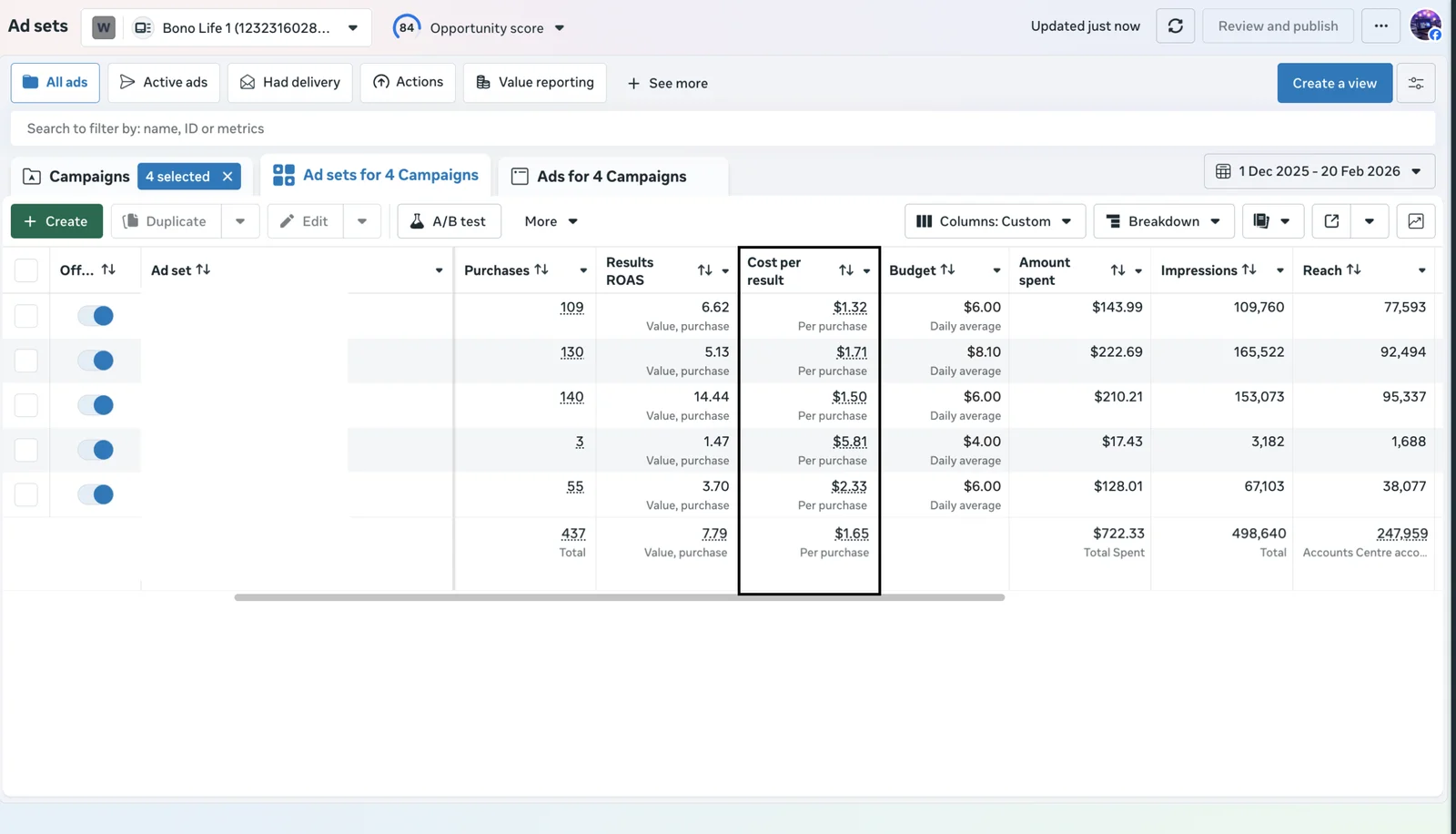By blending high-value educational content with ruthless, data-driven campaign optimization, we turned Bonolife into a highly profitable e-commerce engine. In just a short window, the campaigns generated 437 total website purchases with an incredibly efficient CPA of just $1.65 per purchase. By systematically scaling the winning creatives and utilizing tight retargeting, we achieved an outstanding overall Purchase ROAS of 7.79 on a total spend of $722.33.